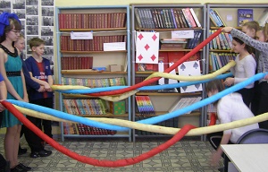 Спустившись «Вниз по кроличьей норе», Алиса выпила из пузырька воду и стала маленькой. Каково же чувствовать себя великаном? Участникам игры пришлось состязаться в заплетании трехметровых кос Алисы. Съев булочку, уменьшившаяся Алиса вместе с гостями попадает на «Безумное чаепитие». Участники игры выбрасывают гигантский кубик для игры в кости. Тому, кому выпало число 6, пришлось надеть костюм кролика и попробовать себя в разрезании шоколадки. «В саду говорящих цветов» ребятам пришлось пофантазировать – кто же такой Стрекозел и Мошка-бегемошка. «В гостях у Белой Королевы» участникам игры необходимо было «включить» свое логическое мышление, а «В гостях у Шалтай-Болтая» — решать математические задачи. Повстречавшись с Трулляля и Тралляля, ребята читали зеркальный текст известного английского стихотворения в переводе С. Маршака. Не была забыта и любимая английская игра – крикет. Крикетные клюшки были по-кэрролловски – розовые фламинго.