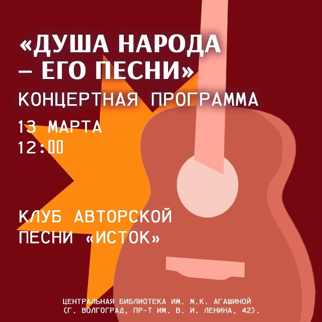 Центральная библиотека им. М. К. Агашиной приглашает на уникальную концертную программу, которая пройдёт 13 марта в 12:00. Вас ждёт встреча с артистами Клуба авторской песни «Исток», которые создадут атмосферу живого общения и тепла, поделятся своим талантом и мастерством!